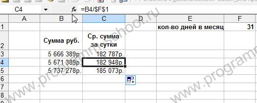Абсолютные ссылки это прямая противоположность относительным ссылкам. Абсолютная ссылка на ячейку остается неизменной при любых манипуляция с формулой. Записываются абсолютные ссылки следующим образом: «=$C$1+$D$5». В этом случае знак «$» фиксирует столбцы и строки. Теперь если протянуть формулу вниз или в сторону, адреса по-прежнему будут «=$C$1+$D$5». Использование абсолютных ссылок полезно в тех случаях, когда необходимо в расчетах использовать один общий для всех формул параметр, при этом, если этот параметр изменяется, его достаточно исправить только в одной ячейке. Рассмотрим пример, в котором необходимо найти среднесуточную сумму продаж, за месяц, в котором 31 день: