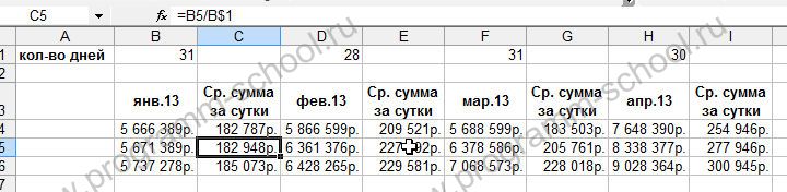 Возьмем пример выше, только добавим суммы продаж по месяцам и по каждому месяцу, с учетом дней в месяце, рассчитаем среднюю сумму в день.