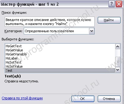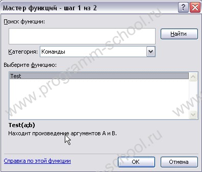 Эту функцию мы можем использовать в других процедурах и функциях vba как вспомогательную или в формулах листа Excel. Хочу обратить ваше внимание, если Вы пишите функции для использования в формулах, то описание функции должно располагаться в модуле (Module) и начинаться только со слова Function. Описание типа Private сделает функцию невидимой в мастере. Поэтому, если использование функции не планируется в формулах, то Вы можете ограничить ее область видимости: Private Function Test (a as integer, b as integer) as integer …..