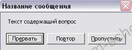MsgBox «Текст содержащий вопрос», vbAbortRetryIgnore, «Название сообщения»