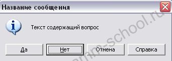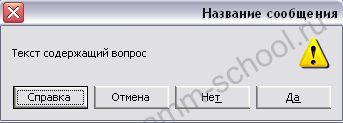Например: MsgBox «Текст содержащий вопрос», vbYesNoCancel+vbInformation+vbMsgBoxHelpButton+vbDefaultButton2, «Название сообщения» построит сообщение вида: