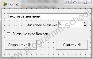 Нам необходимо по нажатию кнопки «Сохранить в INI» сохранить в example.ini (распологается в папке с программой) текстовое значение Edit, числовое значение Spin и логическое значение checkbox. При нажатии кнопки «Считать INI«, соответственно прочитать эти значения.