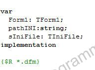 Нам понадобятся две переменные pathINI (будет хранить путь к файлу example.ini) и sIniFile типа TIniFile. Эти переменные должны быть общими для всех процедур в модуле, поэтому их необходимо прописать в разделе var перед implementation